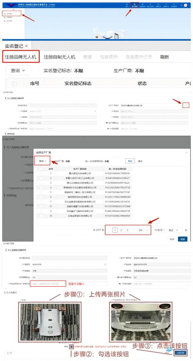 登錄好進入首頁——點擊右上角登記管理——實名登記——注冊品牌無人機——驗證所有人信息——手機掃碼刷臉驗證——選擇生產(chǎn)商名稱(可一頁頁看,也可直接輸入搜索)——選擇型號等相關信息(序列號需手動輸入)——根據(jù)要求長傳照片——完成注冊。